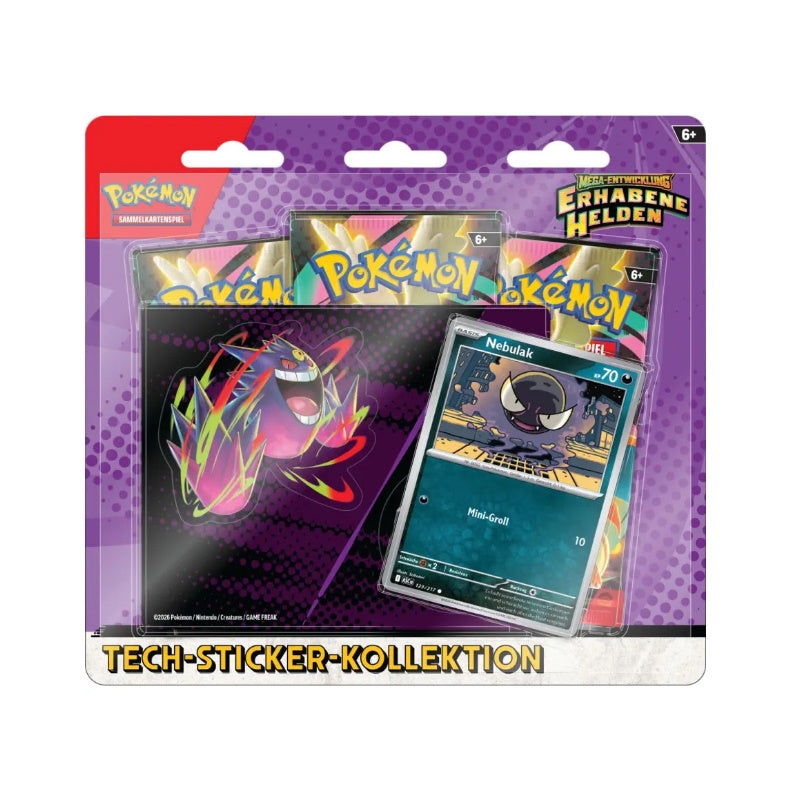 Eine Tech-Sticker-Kollektion der Pokémon Sammelkartenspielerweiterung "Erhabene Helden enthält 3 Boosterpacks sowie eine Promo-Karten und einen Sticker. In der Sprache deutsch.